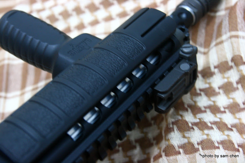 握把也是尼龍纖維材質的 洞洞握把款式 一直找不到kac的徽章 只好用we充數一下...後折托定位也滿確實的